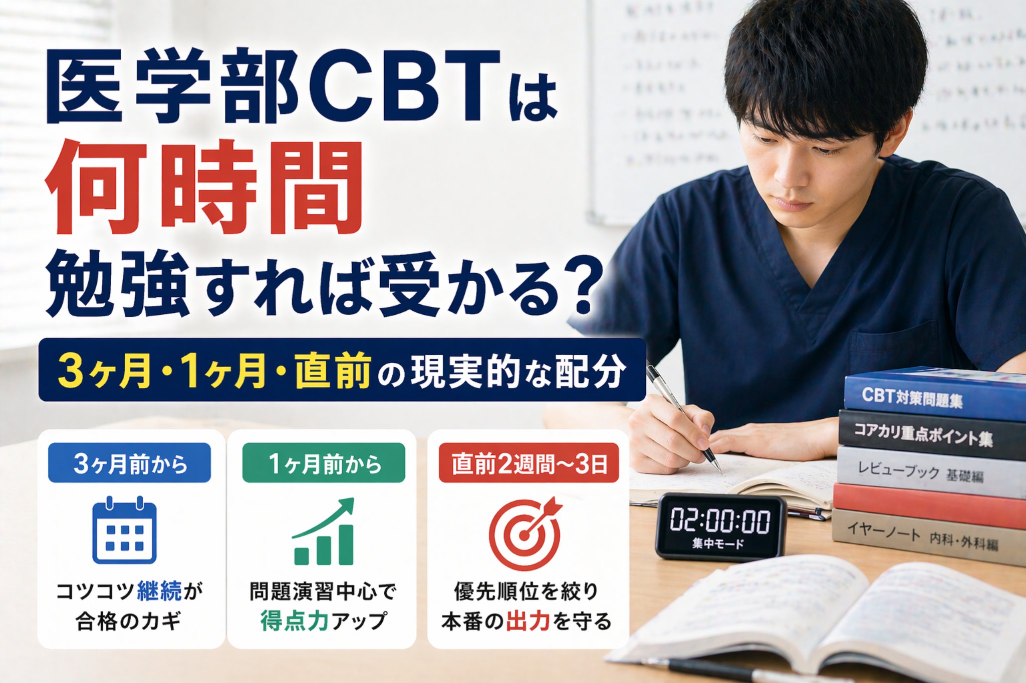 医学部CBTの勉強時間の目安を、3ヶ月前・1ヶ月前・直前期に分けて解説。学内試験と並行する医学生向けに、問題演習と復習時間の配分を整理します。
