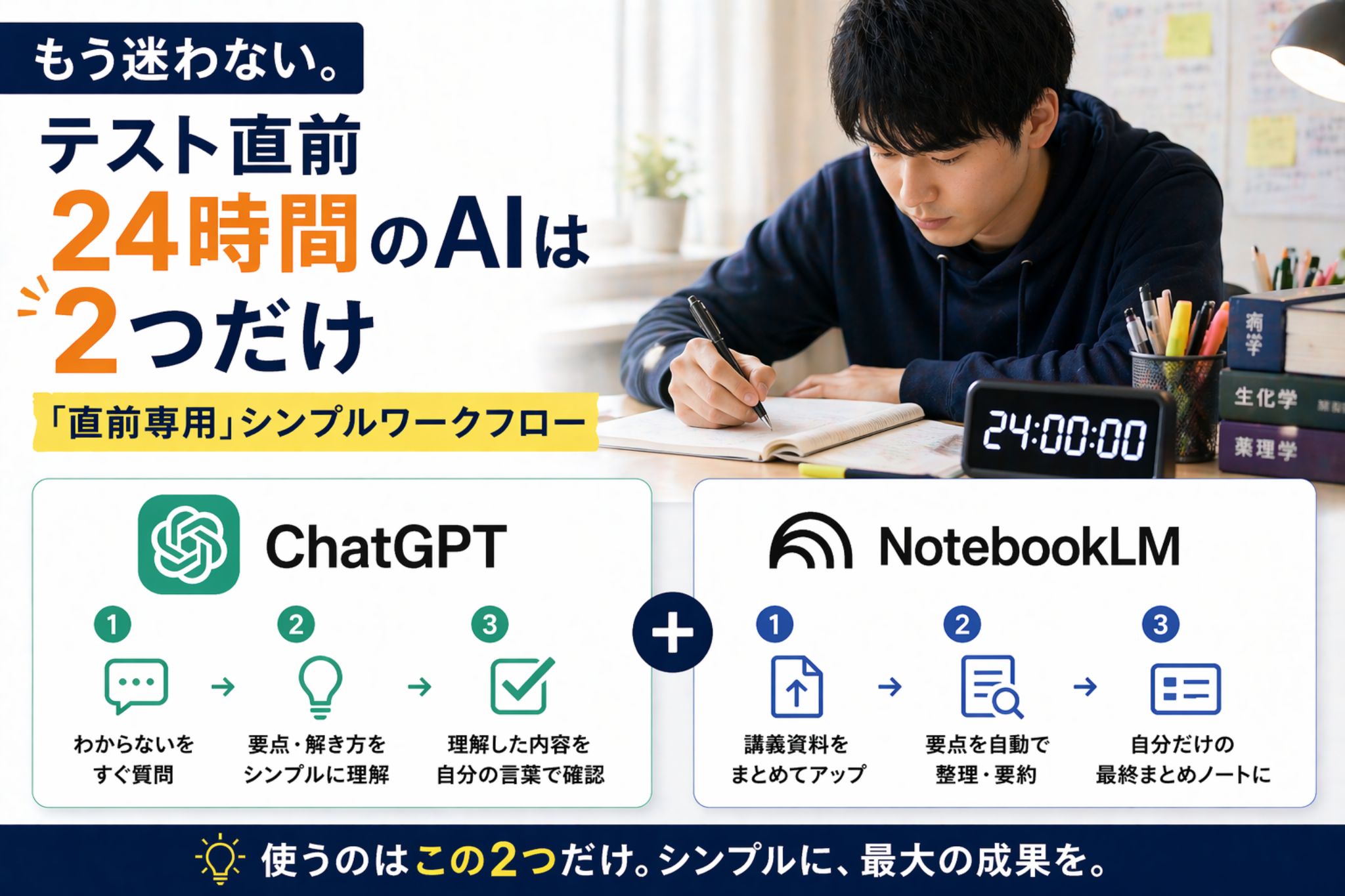 もう迷わない。テスト直前24時間のAIは2つだけ|ChatGPTとNotebookLMの「直前専用」ワークフロー