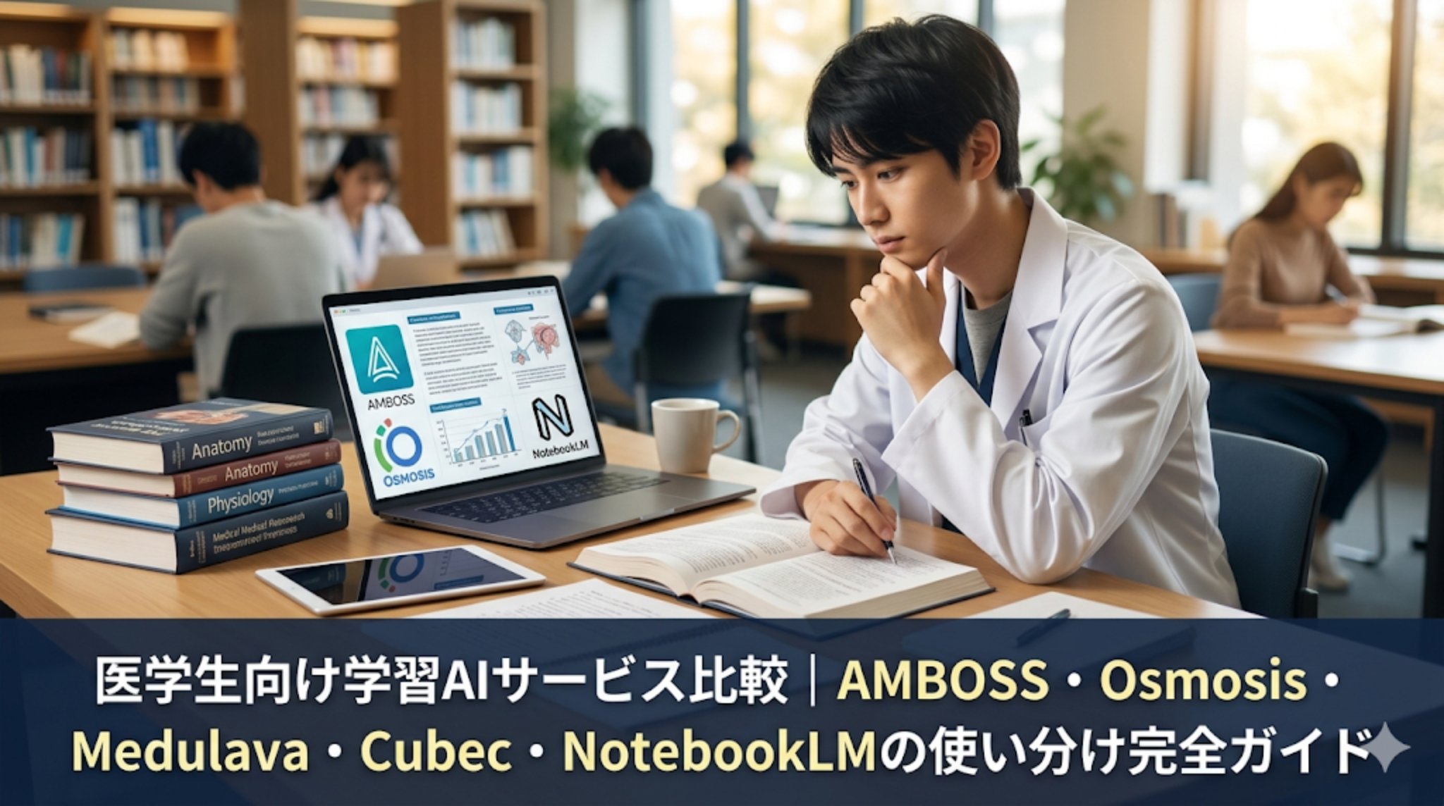 医学生向けの学習AIサービスを、CBT・国試・講義理解・臨床実習・文献検索・暗記の用途別に比較。AMBOSS、Osmosis、Medulava、Cubec、NotebookLM、AnkiHub、ChatGPT系AIの強みと注意点を整理します。